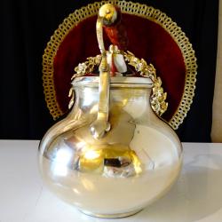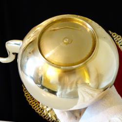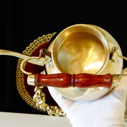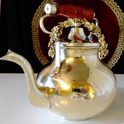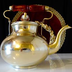 Стар викториански чайник, кана за чай, кафе, греяна ракия и вино, майсторска ръчна изработка от свръх масивен бронз. Вечен чайник, блести като златен от вън и от вътре с прецизен чучур, който излива тънко без да остава капка. Дръжката има ръкохватка от плътно естествено дърво за да не гори ръцете. Височина 18 см., дължина 21 см., диаметър 15 см., тегло 600 гр. Вместимост 900 мл.
