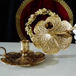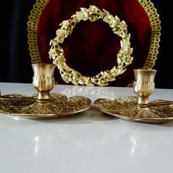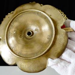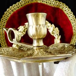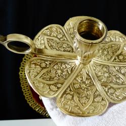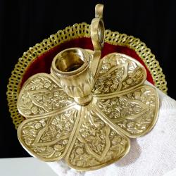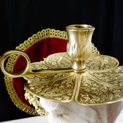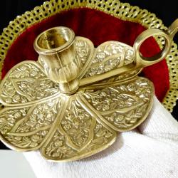 Стар викториански свещник с ръкохватка, майсторска ръчна изработка от масивен високо качествен бронз. Има дизайн на детелина, декориран с приказни релефни флорални орнаменти. Височина 6 см., диаметър 13 см., дължина с дръжката 16 см., тегло на всеки 270 гр. Налични 2 броя, цена 49 лв., за брой.