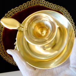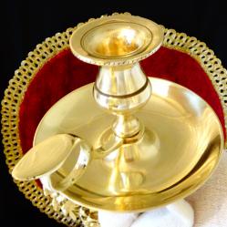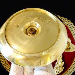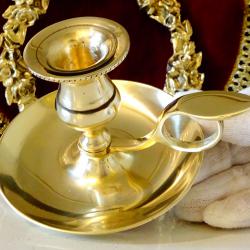 Викториански свещник с дръжка, преносим свещник, майсторска ръчна изработка от свръх масивен бронз-вечен свещник. Декориран с нежен релеф по периферията и с ефектно извита дръжка, блести като златен. Височина 8 см., диаметър 11 см., тегло 330 гр.
