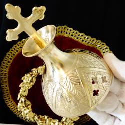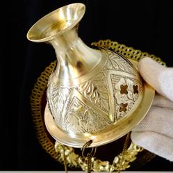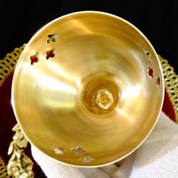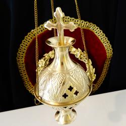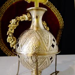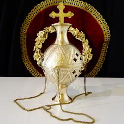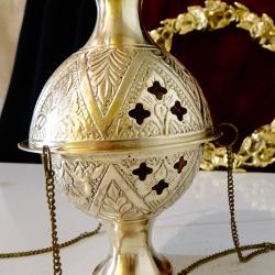 Старо кадило, кадилница, кандило, тамянник, майсторска ръчна изработка от масивен бронз със златен блясък. Декорирано с разкошни релефни орнаменти и ажурни кръстчета. Кадилницата може да се ползва като висяща и настолна. Височина със синджира 32 см., височина на кандилото 19 см., диаметър 10 см., тегло 320 гр.
