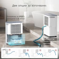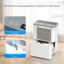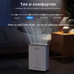 Марка/модел: COLAZE HE Капацитет на влагоуловяване: до 20 литра/ден (30°C, 80% RH) Резервоар: 2,5 литра (сензор за нивото на водата, контролна лампа при пълен резервоар) Възможност за дренаж: чрез маркуч за постоянно оттичане Мощност: 250 W Нива на шум: 39 dB (тих режим) Режими на работа: 2 скорости на вентилатора (Low/High) Таймер: 1–24 часа Специални функции: автоматично размразяване, автоматично изключване при пълен резервоар, защита от преливане, възможност за по-бързо сушене на пране Филтър: миещ се Размери: 40 × 20 × 30 см Тегло: 7,85 кг Цвят: бял Подходящ за площ: до 40–50 m² Работен диапазон влажност: 30% – 90%