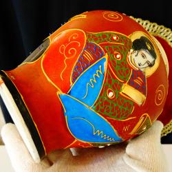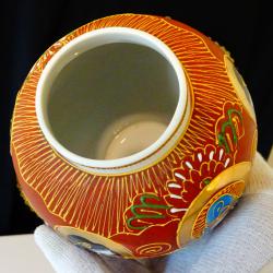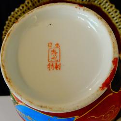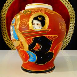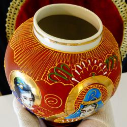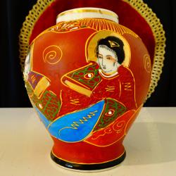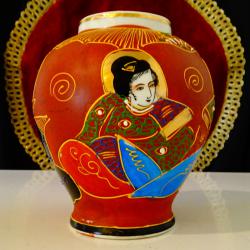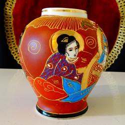 Старинна ваза японски костен порцелан Сацума, ръчно рисувана с изпъкнали цветни емайли Moriage и много злато 24 карата. Изобразена е японската богиня на милосърдието Канон Босацу. От двете й страни стоят учениците на Буда, наречени Rakan. Вазата е маркирана, датира от 1926 г. Височина 12.5 см., диаметър 11 см. Перфектна.