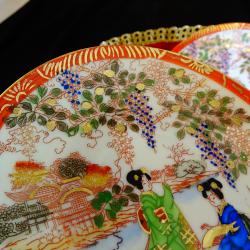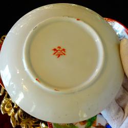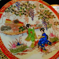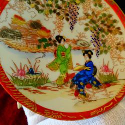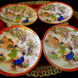 Японски порцеланови чинии, купички, японски костен порцелан, ръчно рисувани с гейши сред красиви японски градини и много злато 24 карата. Маркирани, датират от 1930 година. Диаметър 13 см., височина 2 см. Налични 4 броя, цена 6.50 лв. / 3.32 € за брой.